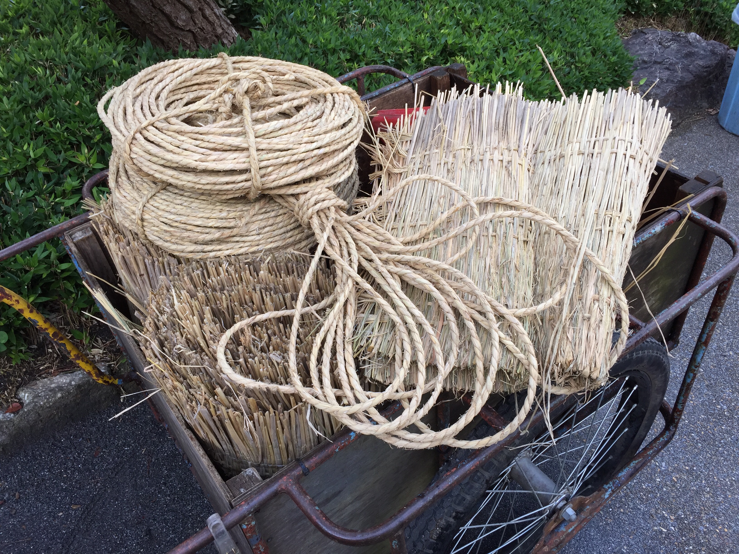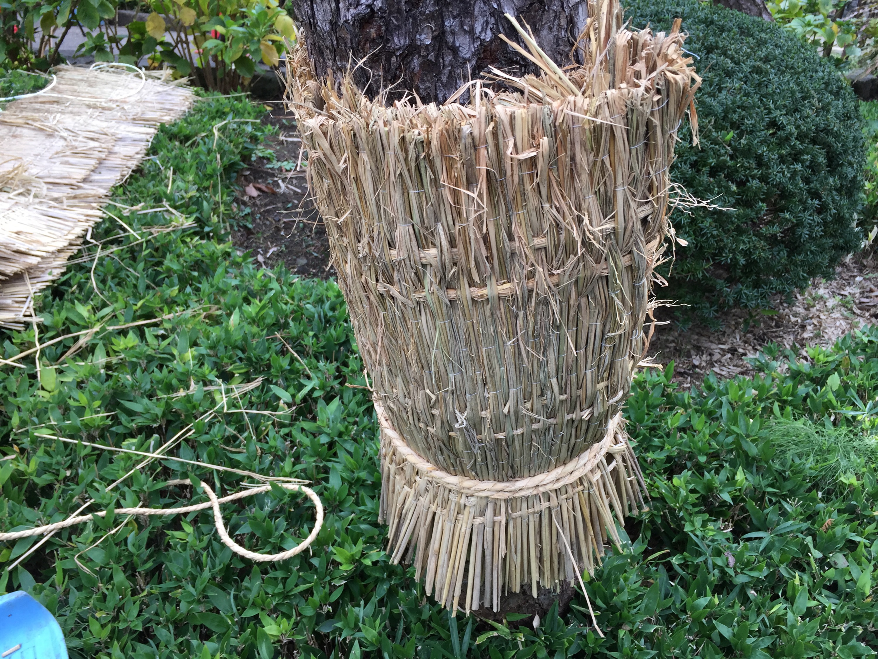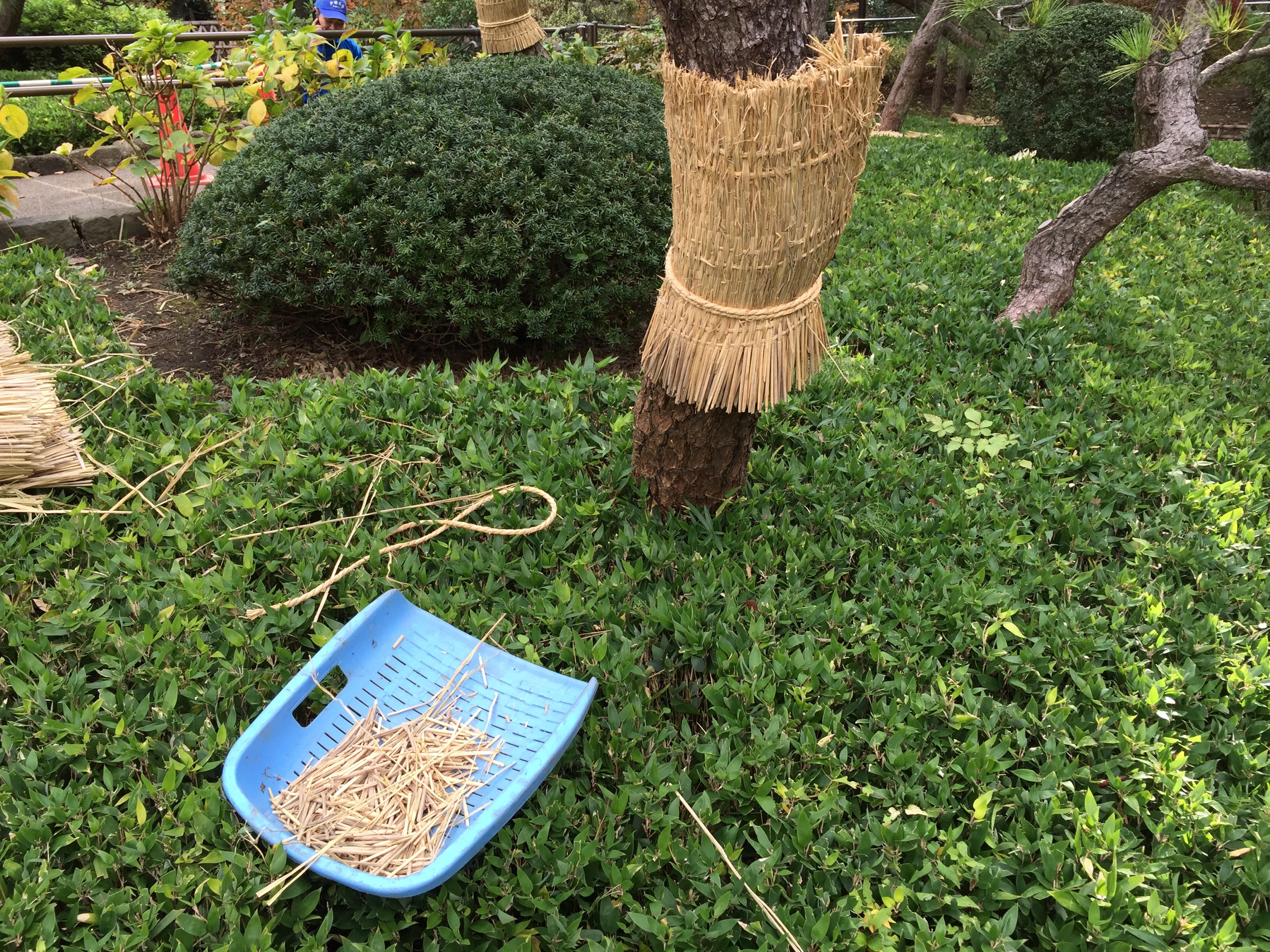 害虫駆除というより、冬に向けての風物詩。マツのこも巻きを行ないました。